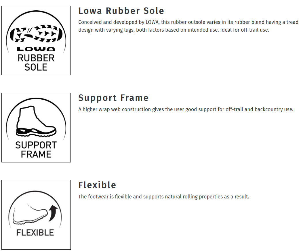 Thanks to the slightly elevated LOWA-Monowrap frame, the sole construction provides optimal stability and a simple, everyday design. The necessary grip is delivered by the LOWA Multi-Trac outsole thanks to its multifunctional profile design. With the help of the GORE- TEX membrane, the boot is 100% waterproof and highly breathable.