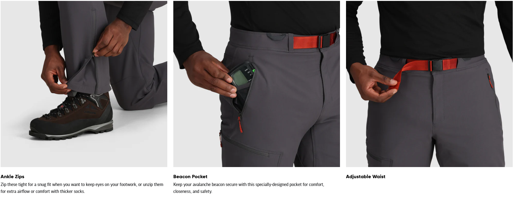 Crafted from a bluesign® approved nylon blend, the 90D stretch double weave fabric offers unparalleled abrasion resistance and breathability. Movement-mirroring stretch and articulated knees ensure freedom of movement while climbing, skinning, or descending. Thermoregulating ActiveTemp™ treatment on the brushed tricot-lined waistband adapts to the body's temperature, and an avalanche beacon pocket with clip secures critical safety gear. Gusseted ankle zippers and reinforced scuff guards allow the pants to fit over various boot shapes and sizes and protect from crampons and ski edges. The adjustable waist tabs ensure a perfect fit, and YKK® DWR-treated zippers alongside zip hand and thigh pockets keep essentials safe and dry.