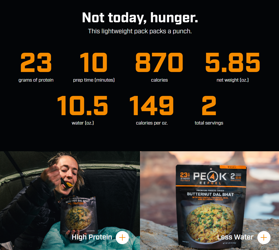 Whether you're stopping for lunch on the trail or getting ready for dinner at your campsite, we guarantee you'll want some Butternut Dal Bhat in your pack. This delicious dish will blow your mind with red lentils, chickpeas, rice, and butternut squash! Oh, and did we mention it's vegan? Just add 1 1/3 cups of boiling water and you're set!