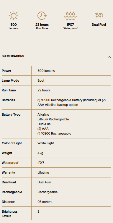 Everyday carry dual-fuel rechargeable pen light. Two-way clip allows pocket, hat-brim, or pack carry with 500 lumens on demand.