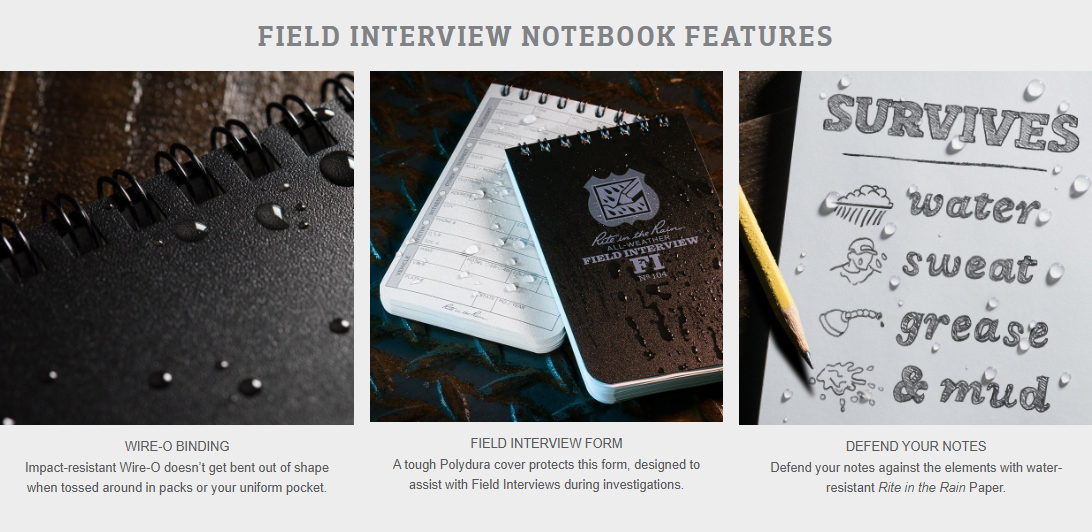 The Rite in the Rain Field Interview Notebook is a loyal partner to law enforcement officers. Our patented weatherproof paper preserves important case notes and witness testimony from poor weather and daily wear-and-tear. Our tough and flexible Polydura cover protects against splashes and abuse, and our impact resistant Wire-O binding won't get bent out of shape. Inside, each sheet features a helpful data entry template on the front and a ruled back side for longhand notes. An officer's notes can make or break a case - keep yours safe on Rite in the Rain All-Weather Paper.