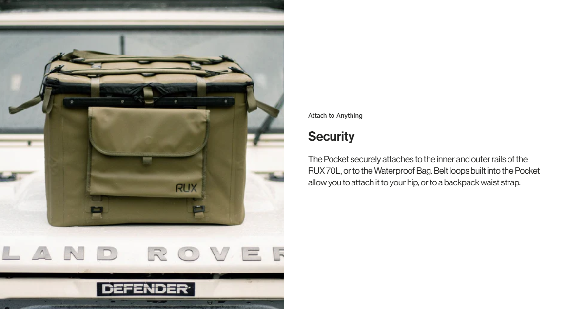 The RUX Pocket 3L is a weather-resistant storage pocket built to keep small essentials organized, protected, and easy to grab. Attach it to your RUX 70L, Waterproof Tote Bag, or Soft Cooler Bag for added modular storage, or carry it on its own for everyday errands, travel, and quick missions. It’s the simple way to keep the little stuff from getting lost—whether that’s cords, toiletries, tools, snacks, or daily carry essentials.