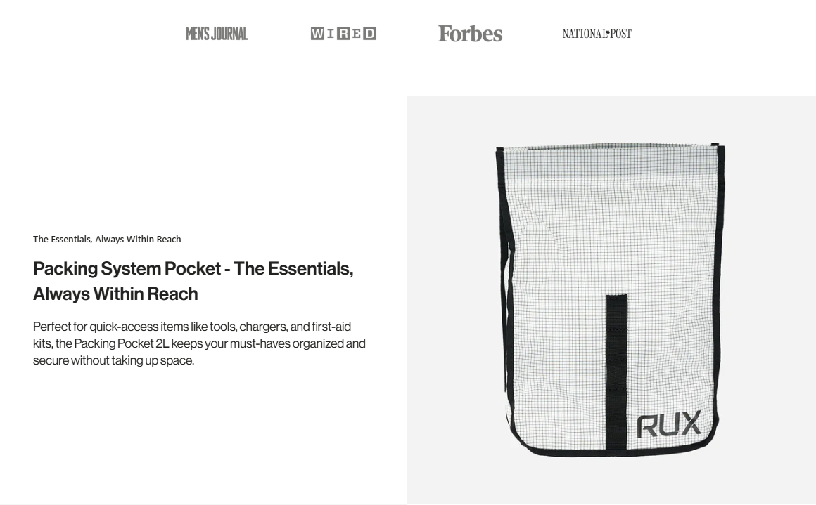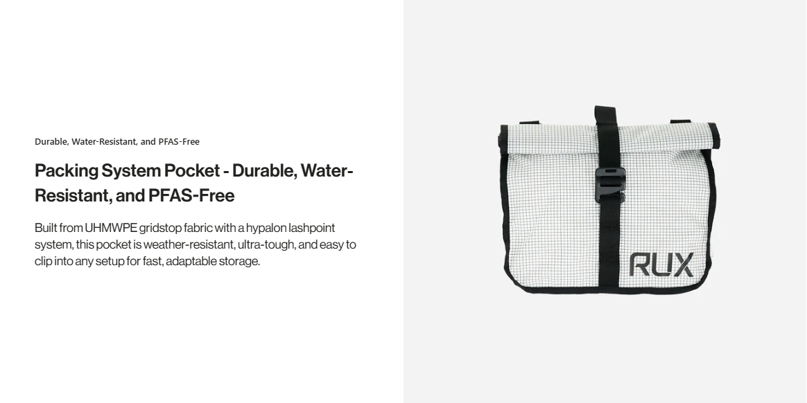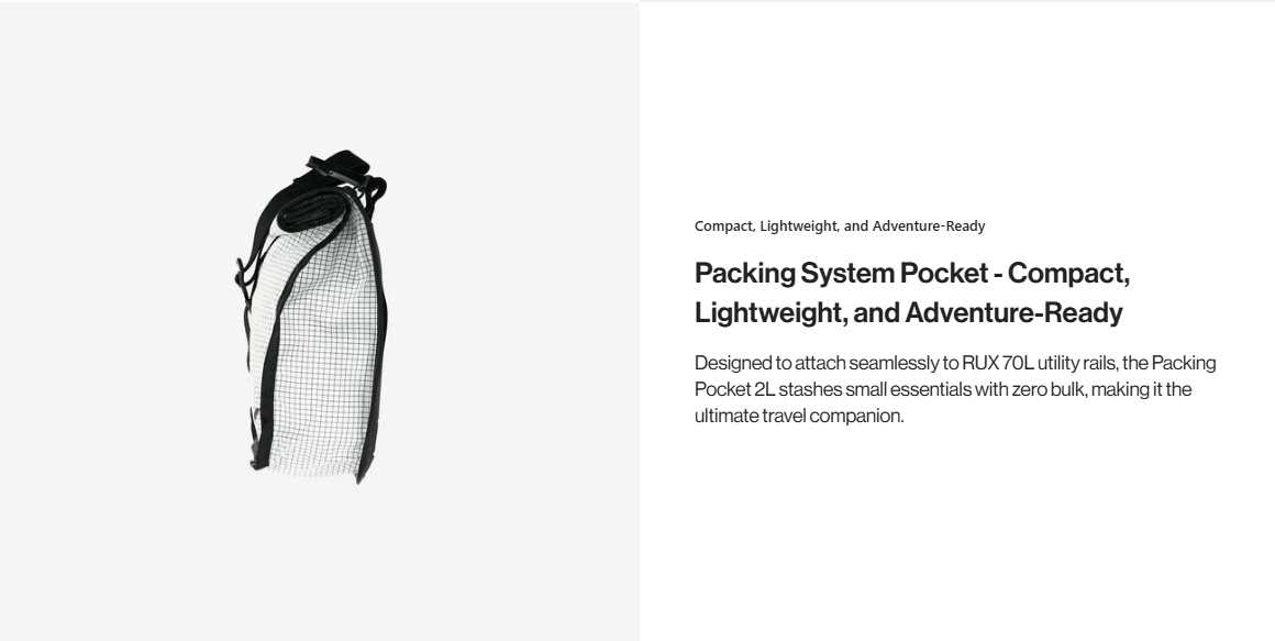 Small but Mighty. Ultimate Quick-Access Storage. The Packing Pocket 2L is the go-to solution for stashing must-have essentials. Whether clipped inside the RUX 70L or carried separately, it provides quick and easy access to your smallest but most important gear.