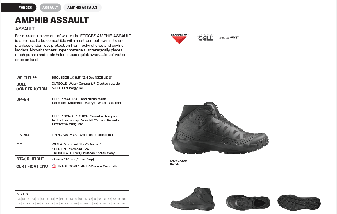 For missions in and out water the FORCES AMPHIB ASSAULT is designed to be compatible with most combat swim fits and provides under foot protection from rocky shores and caving ladders. Non-absorbent upper materials, strategically placed mesh panels and drain holes ensure quick evacuation of water once on land.