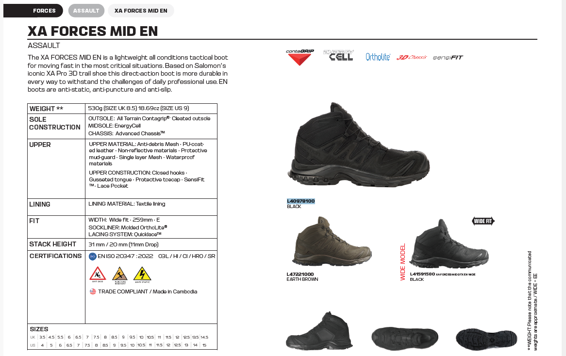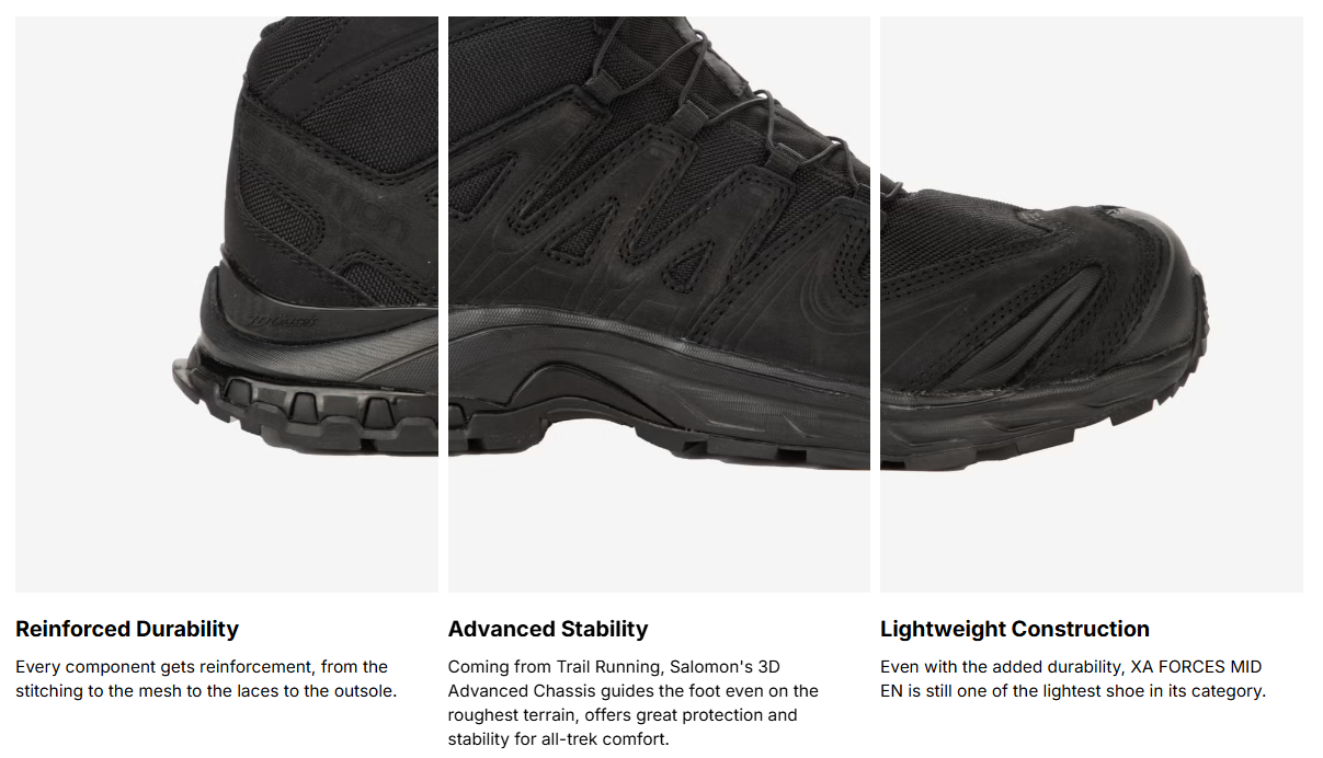 The XA FORCES MID EN is a lightweight all conditions tactical boot for moving fast in the most critical situations. Based on Salomon’s iconic XA Pro 3D trail shoe this direct-action boot is more durable in every way to withstand the challenges of daily professional use. EN boots are anti-static, anti-puncture and oil & slip resistant.