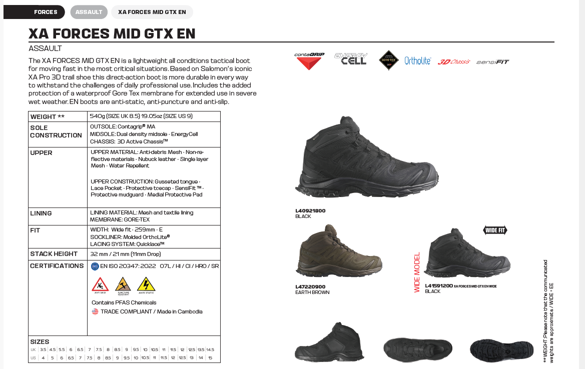 The XA FORCES MID WIDE GTX EN is based on iconic XA Pro 3D trail shoe. This assault boot was created to handle the challenges of professional use. Includes the added protection of a waterproof Gore Tex membrane for extended use in severe wet weather conditions. MADE WITH PFAS CHEMICALS. EN means antistatic, antipuncture, oil & slip resistant.
