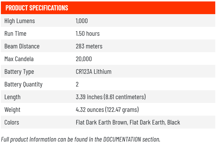 - Powered by two (2) 3-volt CR123A lithium batteries