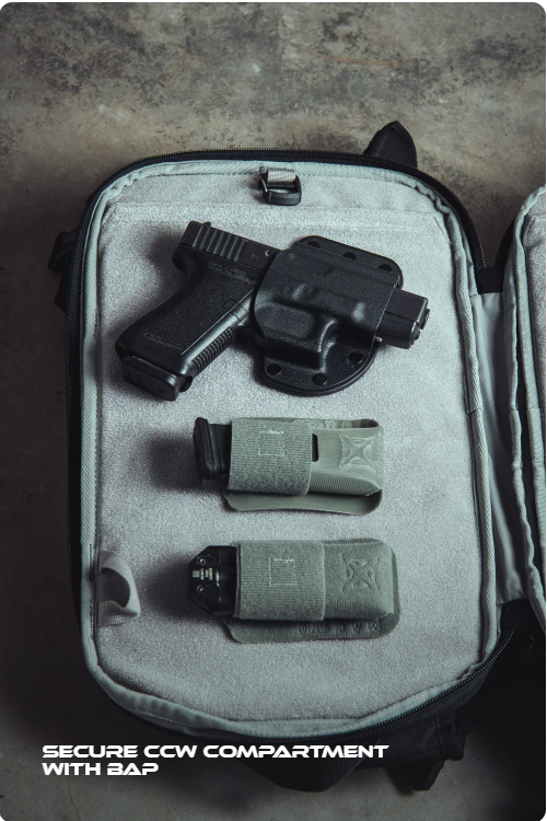 • Spacious CCW compartment with integrated Large BAP strap for secure carry and quick access