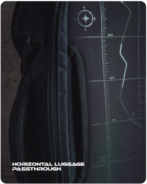 • Foam back panel with vertical and horizontal passthroughs for rolling luggage handles