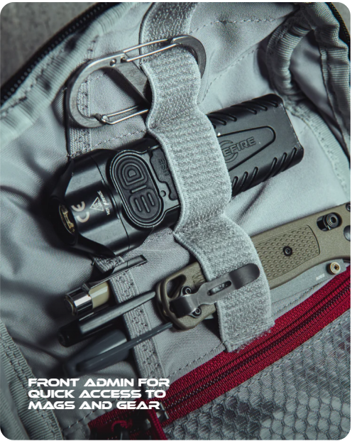 • Front zip pocket reveals horizontal gear slots for mags and med kits, while stretch loop elastic retains modular items like Overflow pouches and other hook-and-loop accessories.