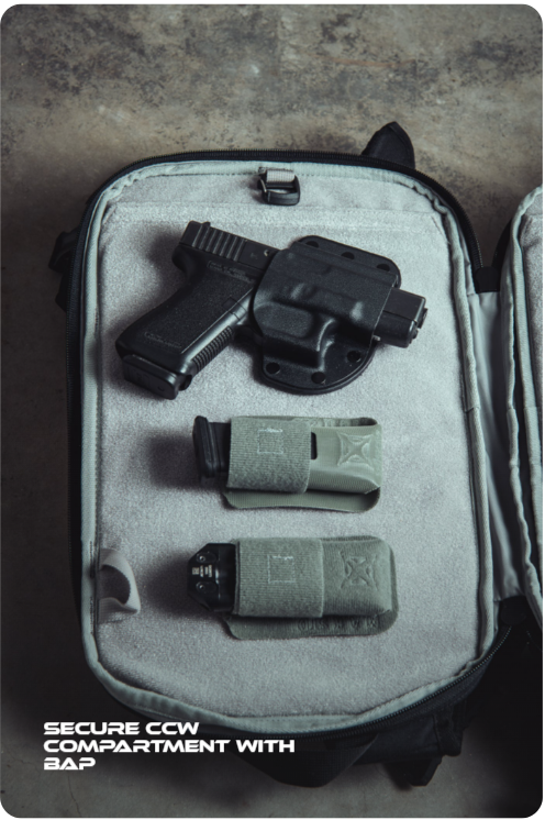 • Hidden sleeve inside CCW compartment for discreet ballistic panel integration without sacrificing accessibility