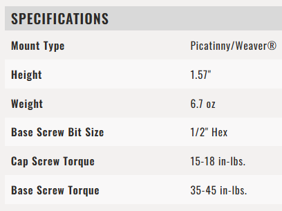 Note: Provides lower 1/3 co-witness mounting height of 40 mm. Will work with most 30 mm red dot sights.