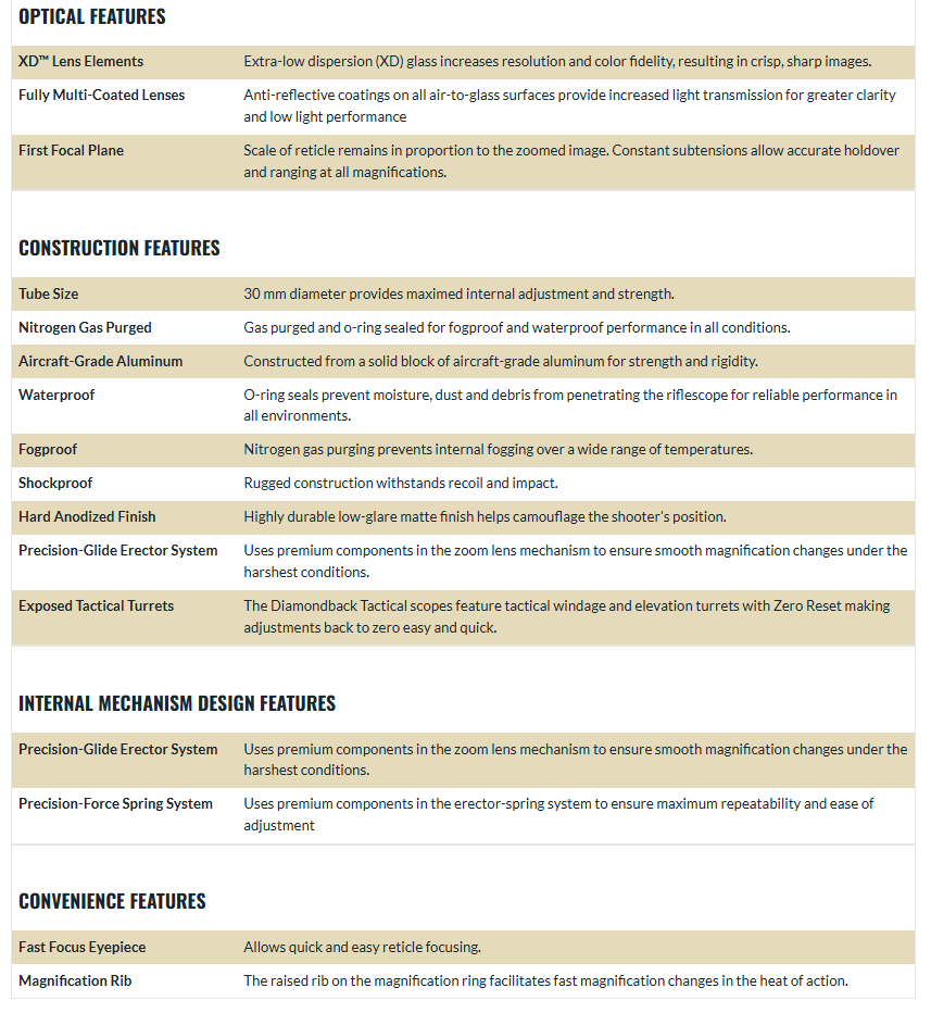 Vortex presents affordable first focal plane (FFP) riflescopes. The first focal plane reticle, a feature ordinarily reserved for 4-figure-priced optics, allows shooters to use the information-packed EBR-2C reticles for ranging, holdovers or windage corrections on any magnification. Housed inside its durable, one-piece aluminum tube is a 4x optical system delivering excellent edge-to-edge clarity and sharp resolution. Exposed elevation and windage turrets are low profile enough to stay out of the way in packing situations, but offer the quickness, ease and precision of dialing accurate shots at distance. A side adjustable parallax gives shooters peace of mind by removing parallax error from the equation from 10 yards to infinity.